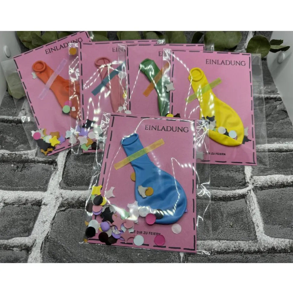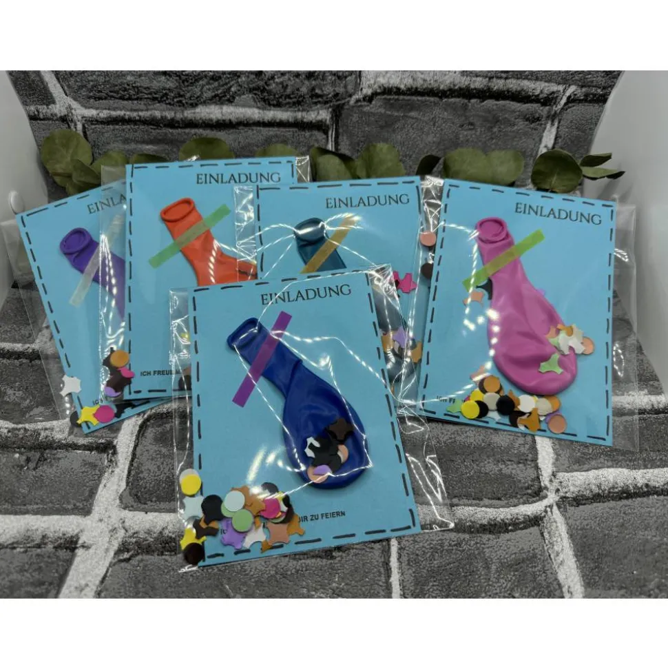 Klappkarte, Luftballon , Folienverpackung, Konfetti und ein vorgedruckter Einleger zum selber beschriften ( bereits eingeklebt).