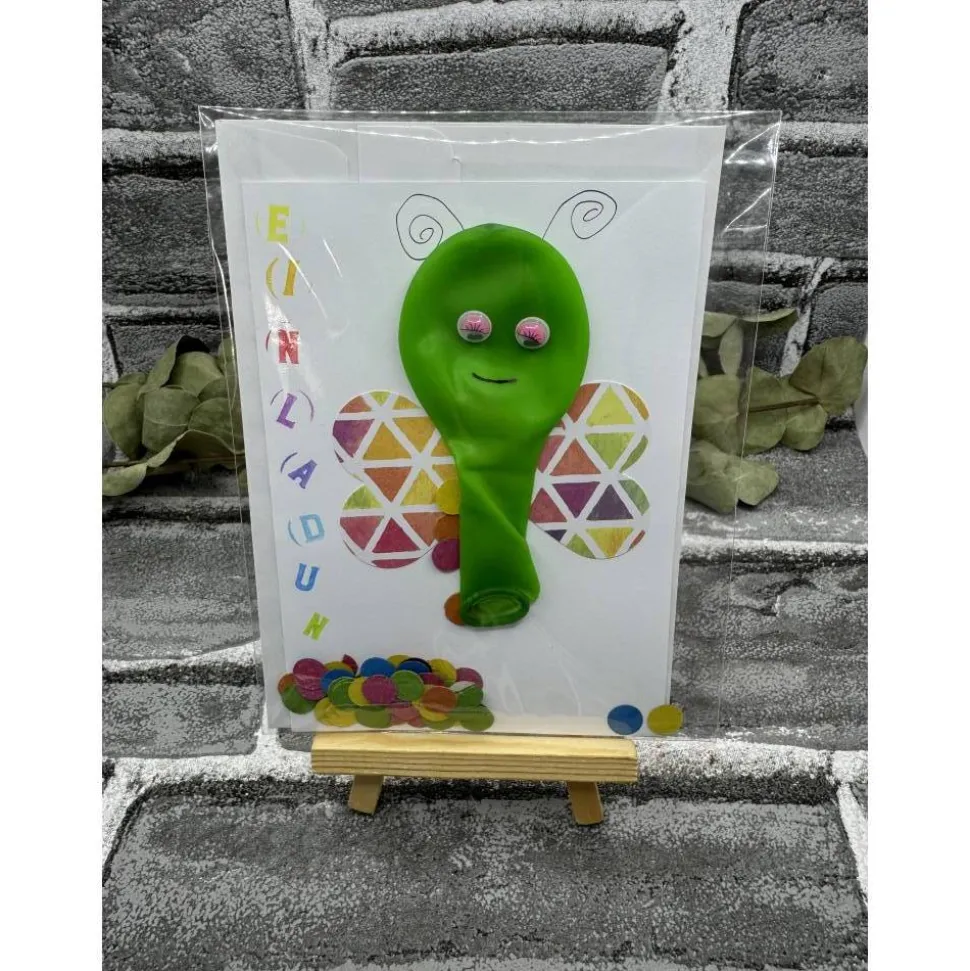 Klappkarte, Umschlag, Luftballon, Konfetti und ein vorgedruckter Einleger zum selber beschriften ( bereits eingeklebt).