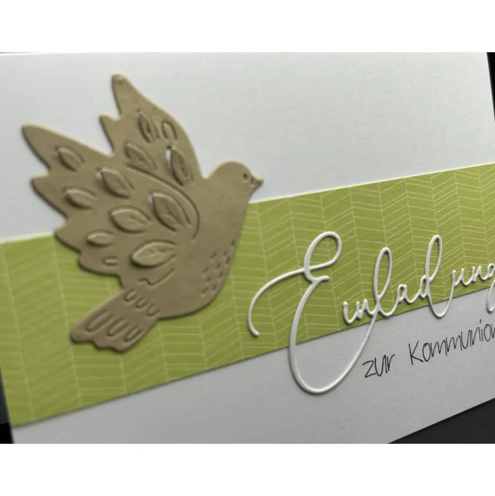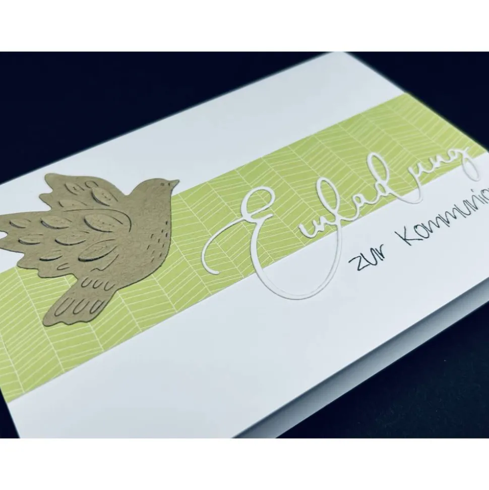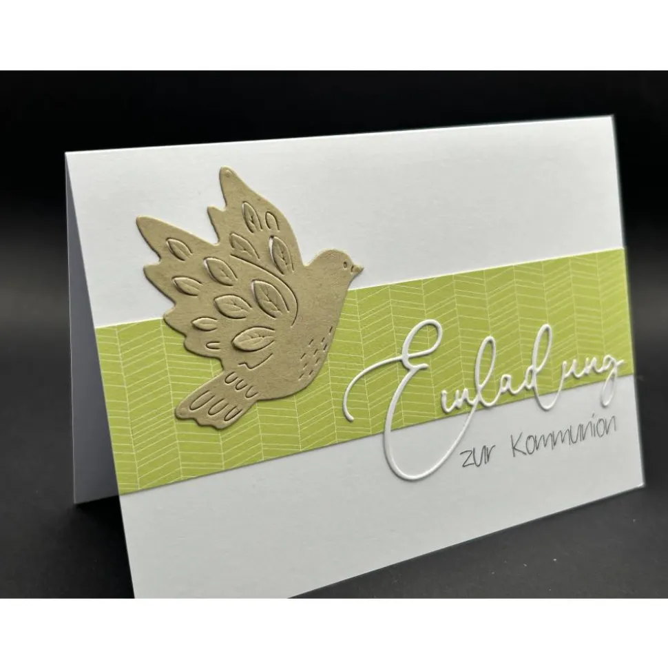 Der Kartenrohling in kristallweiß wird mit verschiedenen Papier- und Stanzteilen gestaltet. Den filigranen Schriftzug „Einladung“ habe ich in Weiß ausgestanzt, den Zusatz gestempelt.