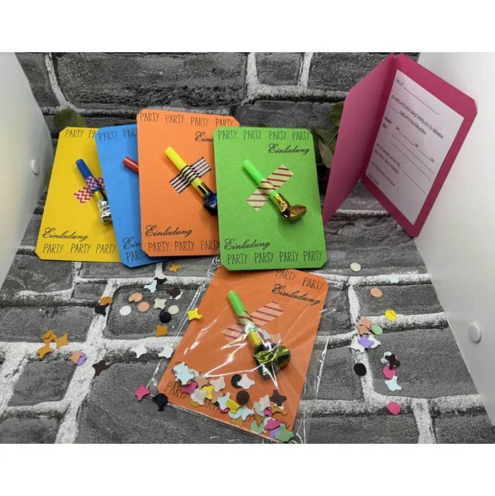 Klappkarte, Luftrüssel , Folienverpackung, Konfetti und ein vorgedruckter Einleger zum selber beschriften ( bereits eingeklebt).