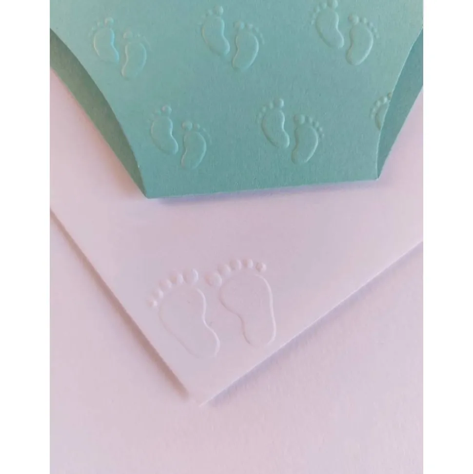 Aufwendig gearbeitete Einladungskarte in Form einer Windel zur Taufe oder zur Babyshower-Party. Die vordere Seite hab ich mit Babyfüsschen geprägt und mit einer Satinschleife versehen, die Rückseite ist ohne Prägung. Innen ist ein weißes Teil angebracht zum selbst beschriften, ich kann es aber auch gerne gegen Aufpreis bedrucken. Auf das Kuvert hab ich kleine Babyfüßchen geprägt, die Karte wird mit quadratischem Kuvert und Klarsichtshülle geliefert.