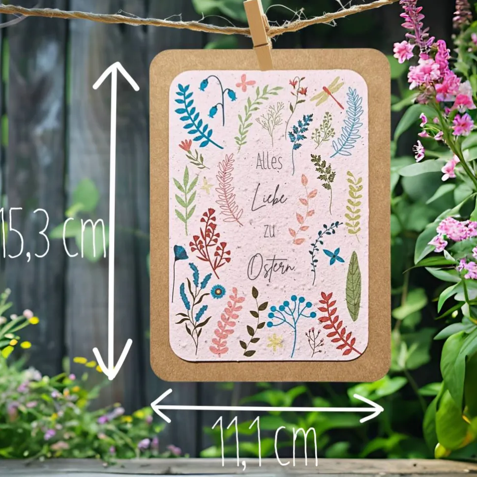 Das Samenpapier enthält Wildblumensamen und kanneingepflanzt werden. Mit Wasser, Licht, Wärme und ein wenig Geduld wachsendaraus echte Blumen. Ein Gruß, der weiterlebt und mit der Zeit sichtbar wird.