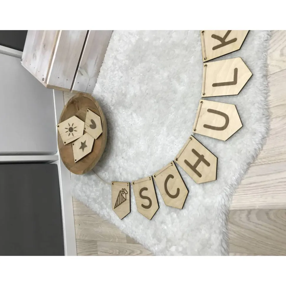 Auf der Holzgirlande wird pro Wimpel ein Buchstabe graviert. Du wählst aus, ob Du zusätzlich am Anfang und Ende je ein Symbol zum Einrahmen des Wortes angebracht haben möchtest. Es stehen eine Schultüte, ein Herz, Stern, Regenbogen, Sonne und ein Zweig zur Verfügung. Die Wimpel sind auf einem Lederband aufgefädelt. So kannst Du deine Kette zu Hause sofort aufhängen.