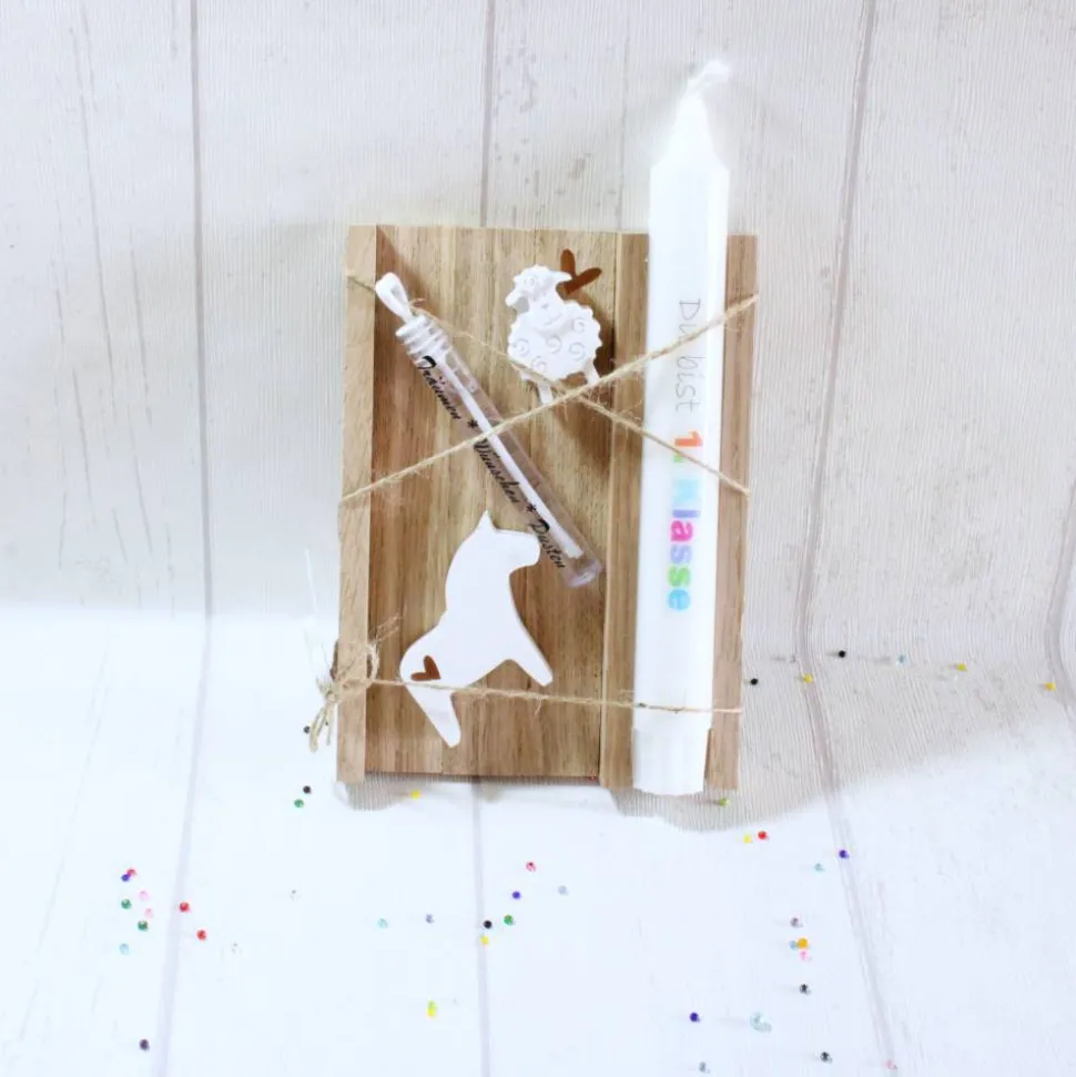 Hier ist ein von mir liebevoll, gestaltetes Geschenkset zur Einschulung. Das Geschenksetz beinhaltet eine Stabkerze mit dem Schriftzug „Du bist 1. Klasse“, sowie zwei Deko-Elemente. Dazu erhaltet Ihr ein Kunststoffröhrchen für Seifenblasen. Das Holztablett kann z.B. hinterher noch als Stifte- oder Kartenhalter benutzt werden