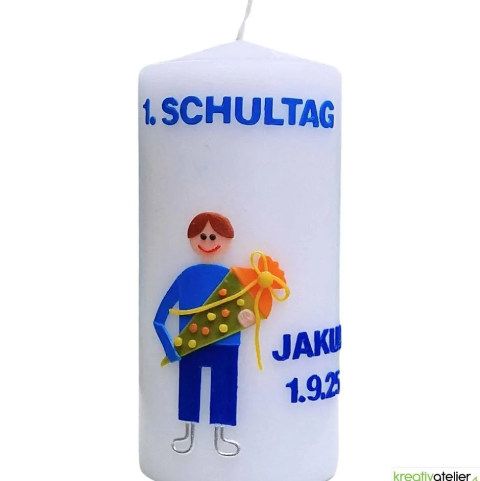 Auf Wunsch kann die Einschulungskerze mit dem Namen und dem Einschulungsdatum personalisiert werden. Die Personalisierung ist im Preis mit enthalten.
