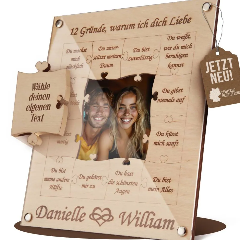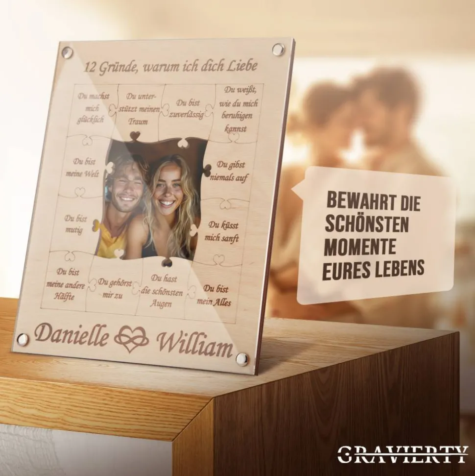Die zweite Schicht präsentiert die wahre Essenz des Rahmens. Hier, vor einem Puzzle-artigen Ausschnitt in der Mitte, werden 12 kurze Texte angezeigt, die die Tiefe der Liebe, Wärme und Geborgenheit reflektieren. Der Ausschnitt bildet das perfekte Zentrum, um das Bild zwischen den beiden Holzplatten einzusetzen, was eine einzigartige und kreative Darstellung ermöglicht.