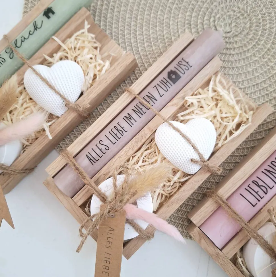 Das Geschenkset wird in einer Holzbox zusammengebunden, mit Trockenblumen (können variieren) verziert und mit einem Anhänger “ ALLES LIEBE “ ergänzt.
