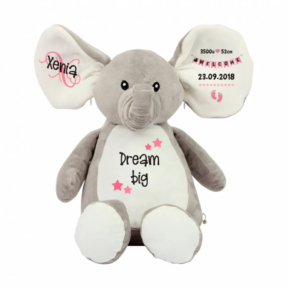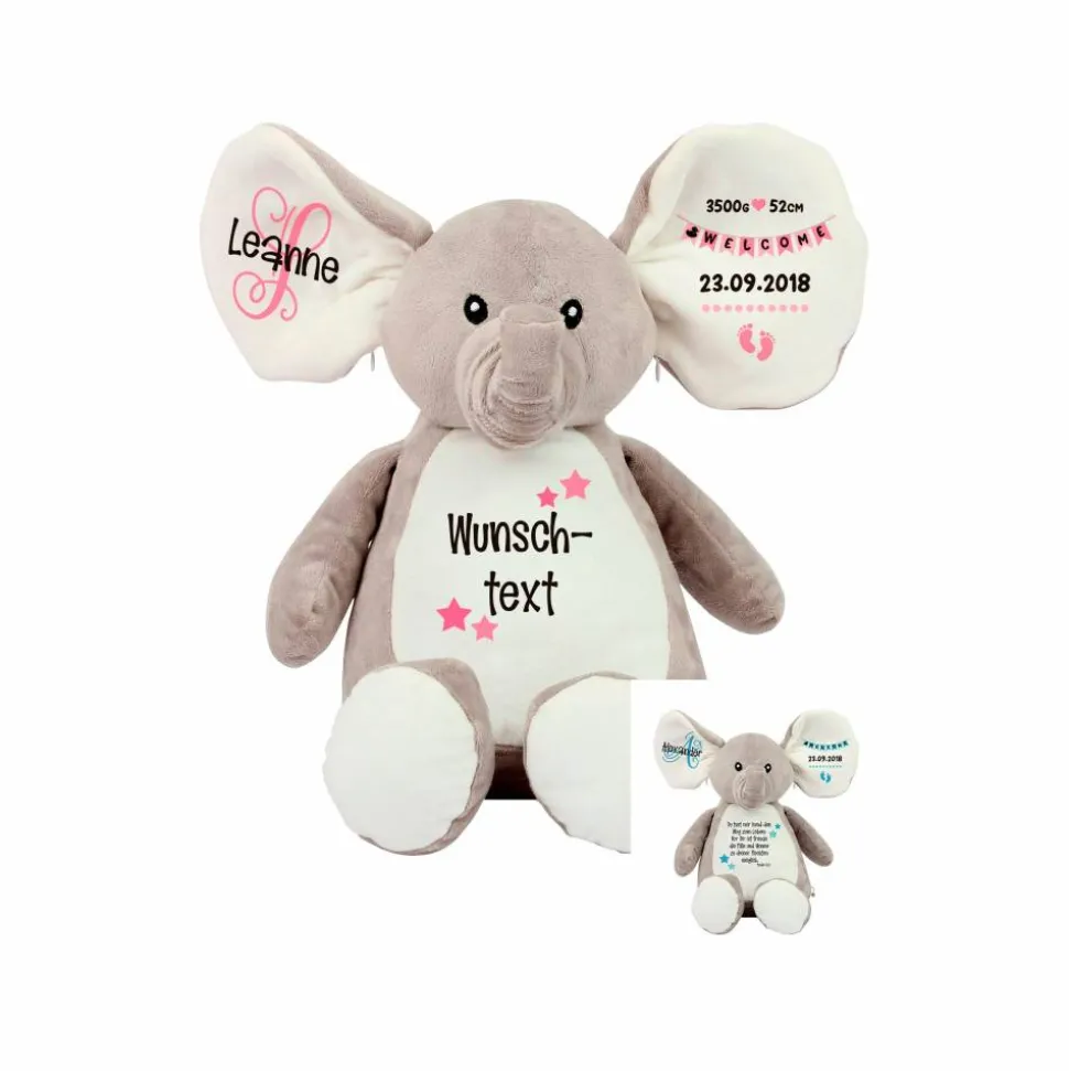 Ein Elefant zum Kuscheln und als tolle Geschenkidee für die Geburt oder die Taufe. Der Elefant kann an beiden Ohren und am Bauch mit Namen und weiteren Daten (siehe weiter unten) personalisiert werden. Das 46cm große Stofftier ist nicht nur ein individuelles Baby-Geschenk, sondern auch eine schöne Erinnerung für die Eltern.