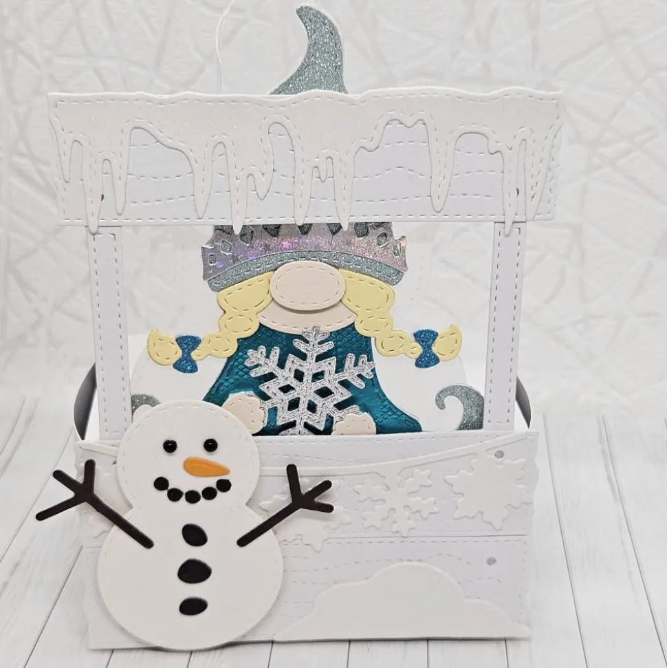 Einzigartige Buden-Front mit Glitzer-Dach: Die Front der Box ist im Stil einer Winterbude gestaltet (ca. 13 cm hoch und 10 cm breit). Das Dach ist mit dicken Eiszapfen-Elementen verziert, die mit glitzerndem Material überzogen sind, um einen frostigen, funkelnden Effekt zu erzielen.