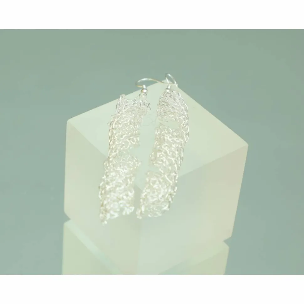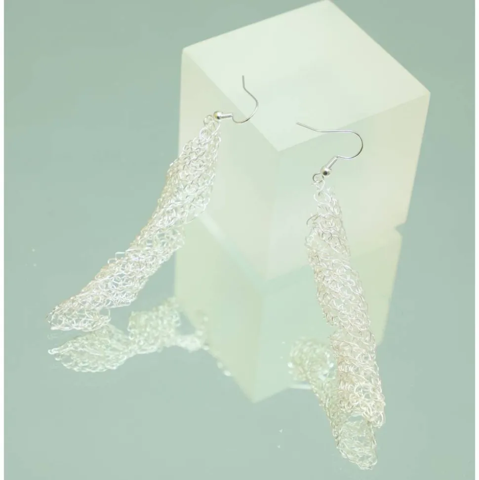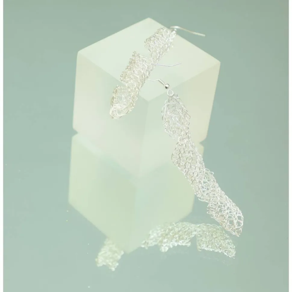 aus lackiertem Silberdraht gehäkelte lange Spiralen