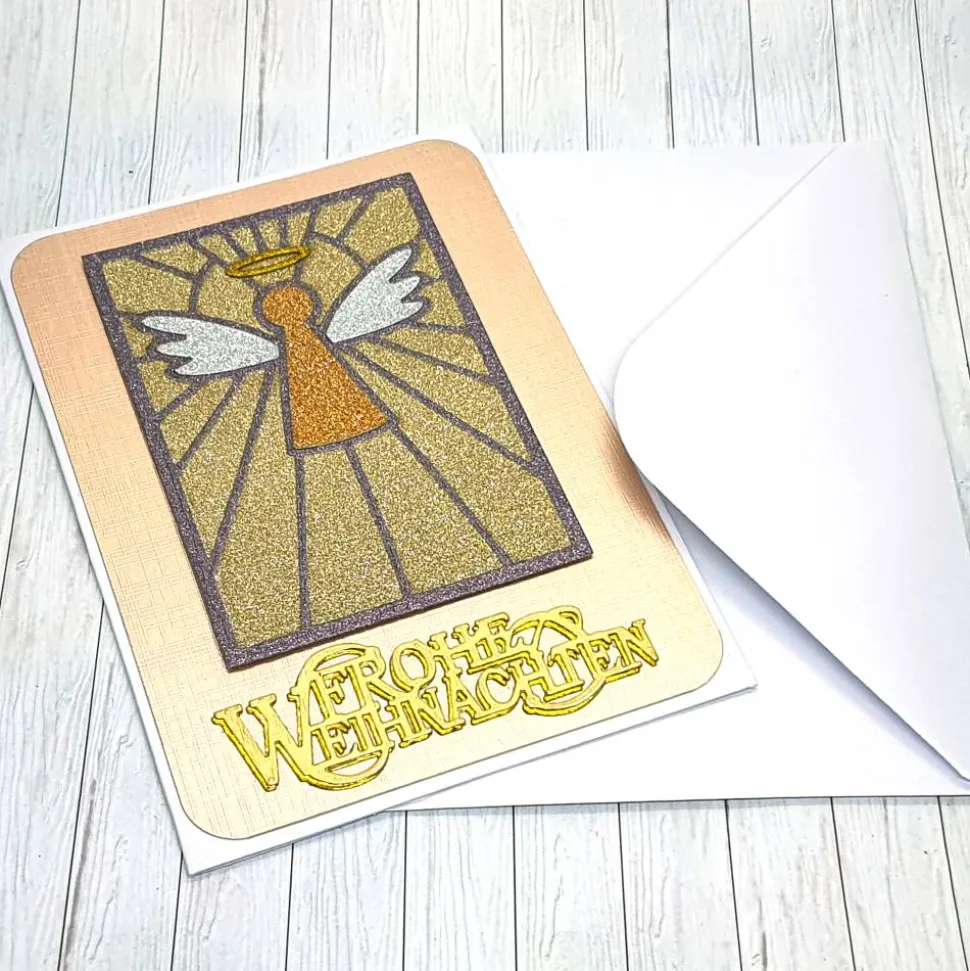 Erlebe eine stilvolle Weihnachtszeit mit der Weihnachtskarte Engelsfenster. Diese elegante Karte im Format A6 besticht durch ihr raffiniertes Motiv, das einem Kirchenfenster mit einem Engel nachempfunden ist. Die Kombination aus Metall- und Glitzereffektpapier sorgt für einen festlichen Blickfang.