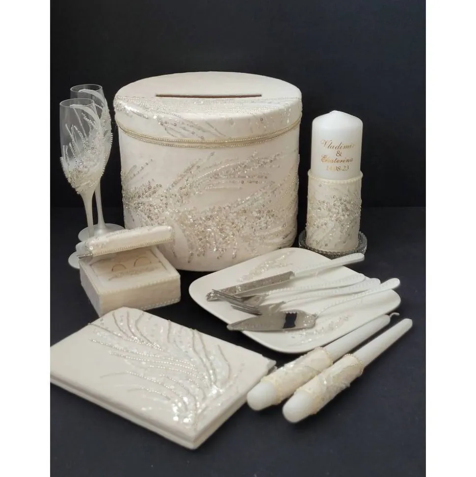 Verleihen Sie Ihrer Hochzeit einen Hauch von Eleganz mit diesem exklusiven Set aus milchweißem Samt, verziert mit hochwertiger Spitze und Pailletten. Jedes Stück wird liebevoll von Hand gefertigt, um Ihre besonderen Momente noch unvergesslicher zu machen.