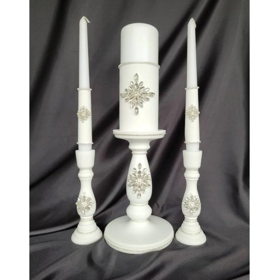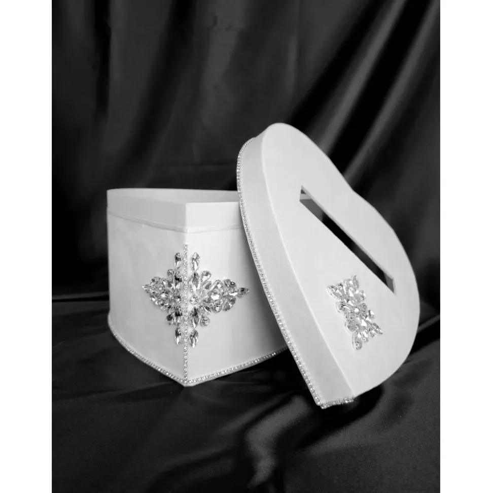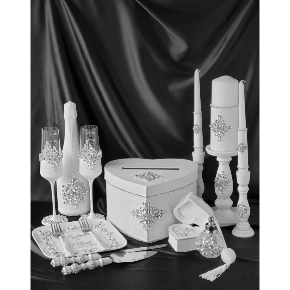 Verleihen Sie Ihrer Hochzeit einen Hauch zeitloser Eleganz mit diesem weißen Wildleder-Set, verziert mit funkelnden Kristallen. Romantisch, luxuriös und individuell für Sie gefertigt.