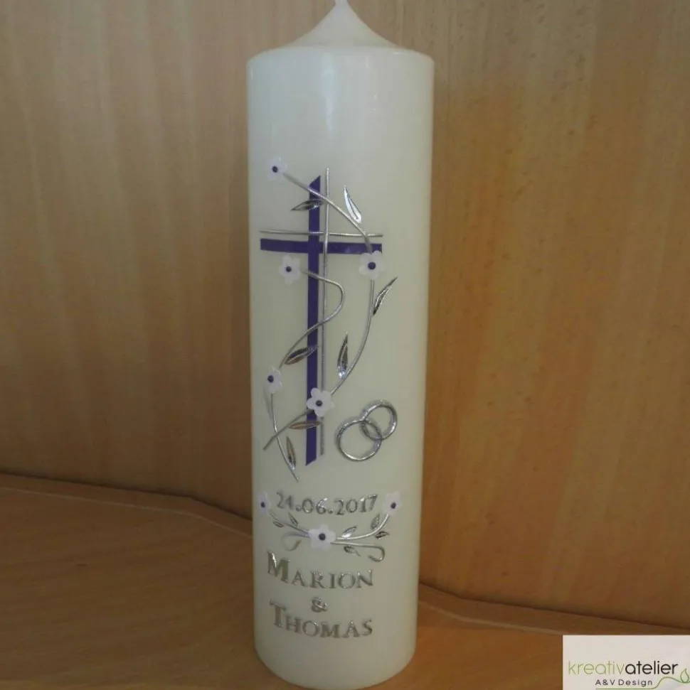 Die Hochzeitskerze Prag mit „Flieder-Kreuz“ macht Ihre Hochzeit zu einem unvergesslichen Erlebnis. Die Kerze wird in liebevoller Handarbeit verziert und ist damit einzigartig in ihrer Optik.