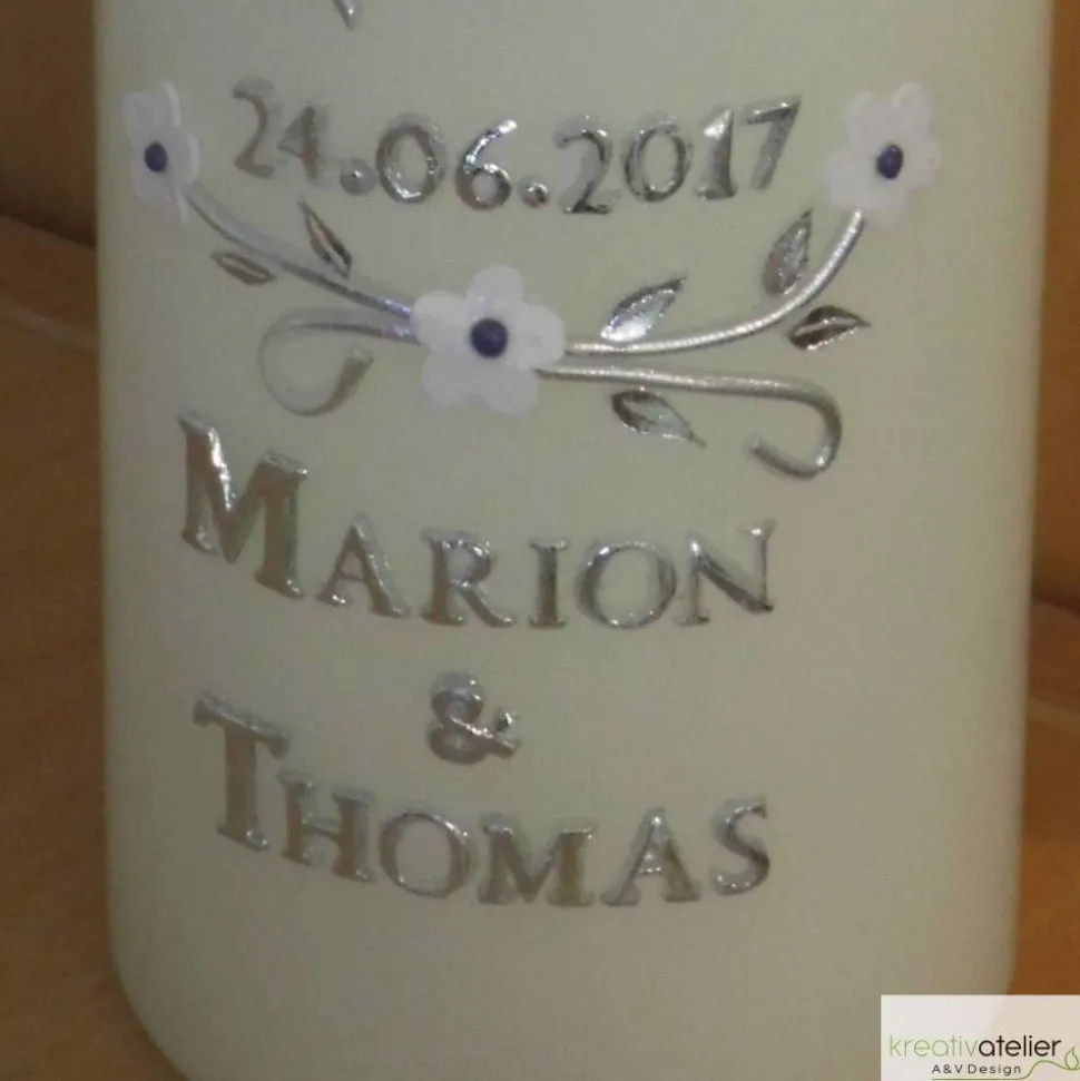 Diese Hochzeitskerze wird in meinem Atelier individuell für Sie gefertigt. Als Rohling verwende ich ausschließlich Qualitätskerzen mit RAL-Gütesiegel, die in Deutschland nach traditionellen Verfahren gezogen werden.