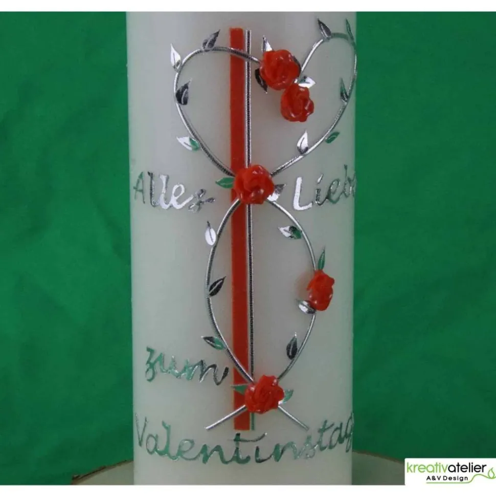 Alle Ornamente werden einzeln von Hand aus verschiedenen Wachsplatten ausgeschnitten und kunstvoll auf der Kerze zu einem Gesamtbild arrangiert. Personalisieren Sie die Kerze zum Valentinstag mit einem persönlichen Gruß, z. B. „Dein Andy“. Bitte teilen Sie uns dazu Ihren Text mit. Dieser Gruß ist im Preis enthalten.
