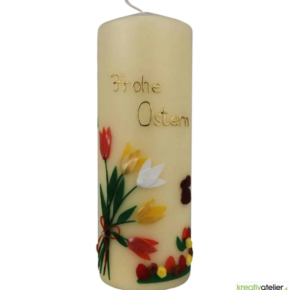 Künstlerisch von Hand gestaltete Osterkerze, die mit wunderschönen Oster-Accessoires aus Echtwachs detailreich verziert ist. Diese Liebe zum Detail wird an den verschiedenfarbigen Tulpenblüten deutlich, die teilweise aus mehrlagigen Wachsschichten bestehen. Dadurch wirken sie sehr natürlich. Das Osternest mit den bunten Eiern ist ähnlich gearbeitet, es hebt sich deutlich von der Kerze ab. Die Beschriftung „Frohe Ostern“ ist aus echtem Wachs handgefertigt und fester Bestandteil der Kerze.