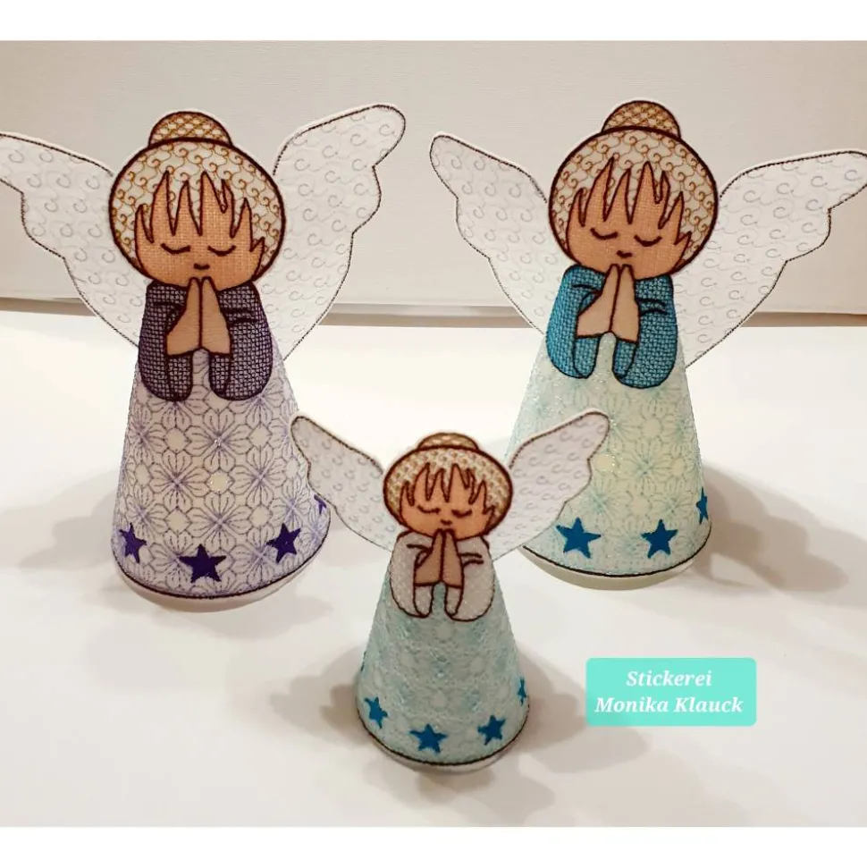 Der Engel ist komplett ausgestickt, also auf den mit Stickvlies verstärkten Stoff, dann habe ich das ganze rundherum ausgeschnitten. Dort wo die Flügel beginnen ist das Teil auf einer Seite von oben eingeschnitten und auf der anderen Seite von unten. So kann der Engel auf dem Rücken an den Flügeln geschlossen werden.