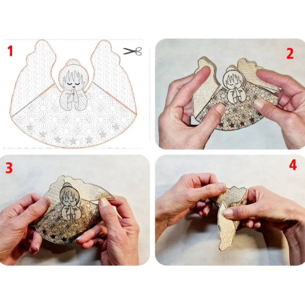Der Engel ist komplett ausgestickt, also auf den mit Stickvlies verstärkten Stoff, dann habe ich das ganze rundherum ausgeschnitten. Dort wo die Flügel beginnen ist das Teil auf einer Seite von oben eingeschnitten und auf der anderen Seite von unten. So kann der Engel auf dem Rücken an den Flügeln geschlossen werden.