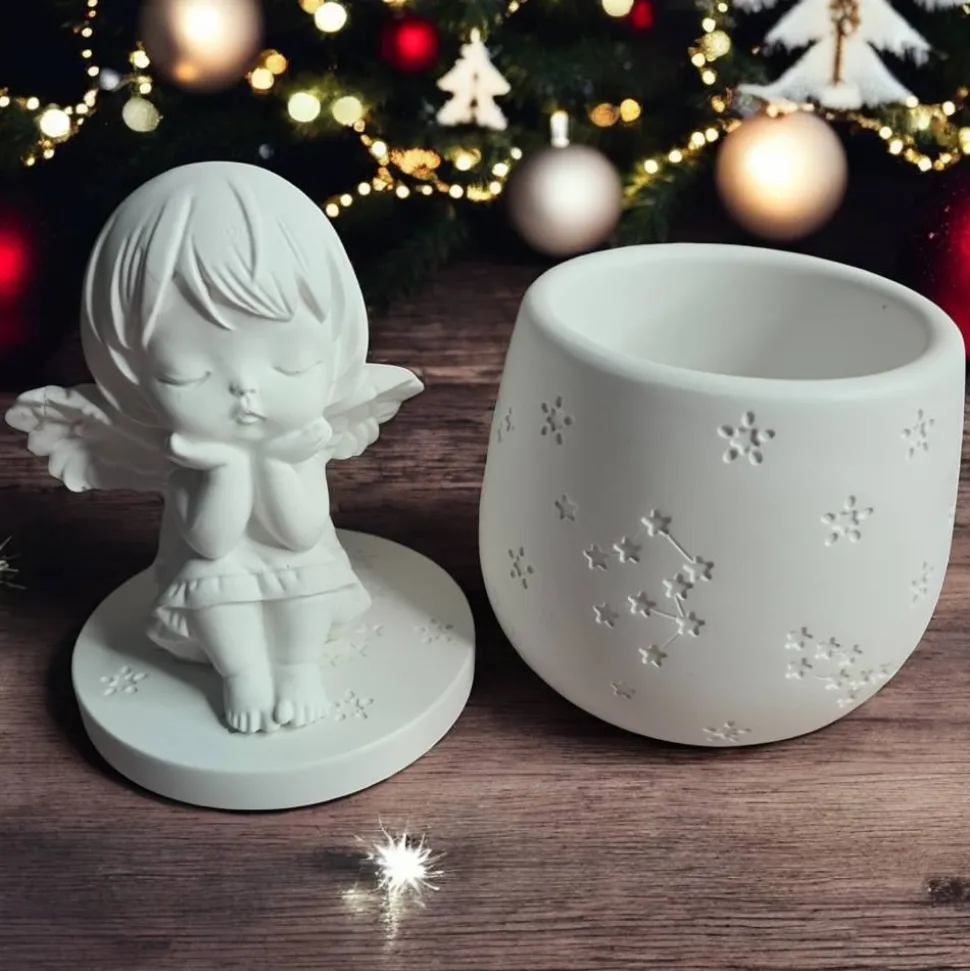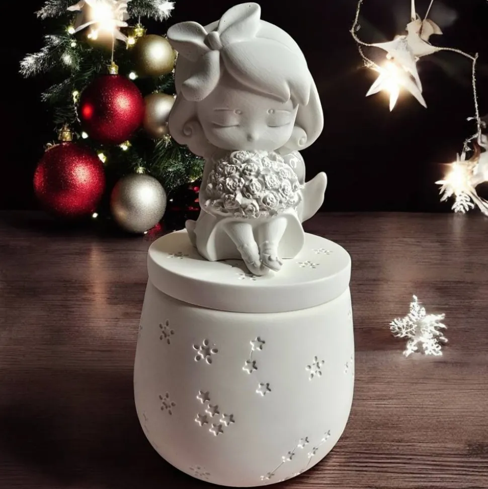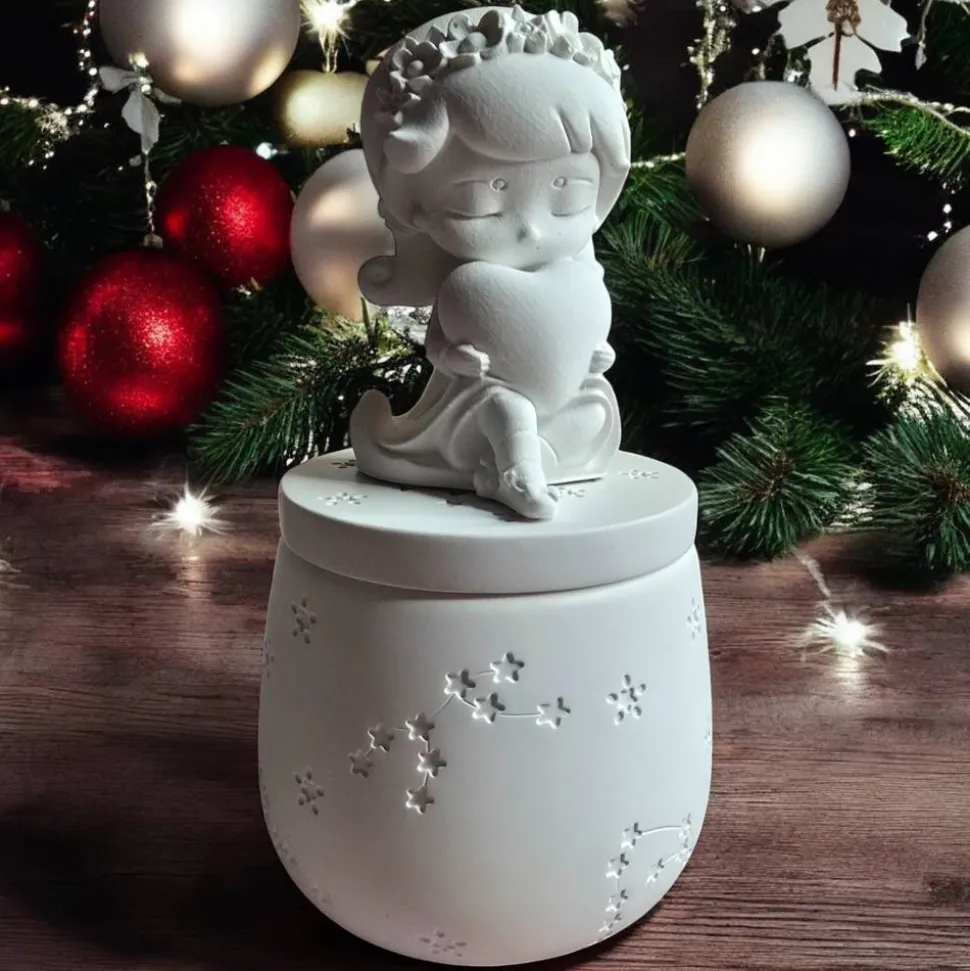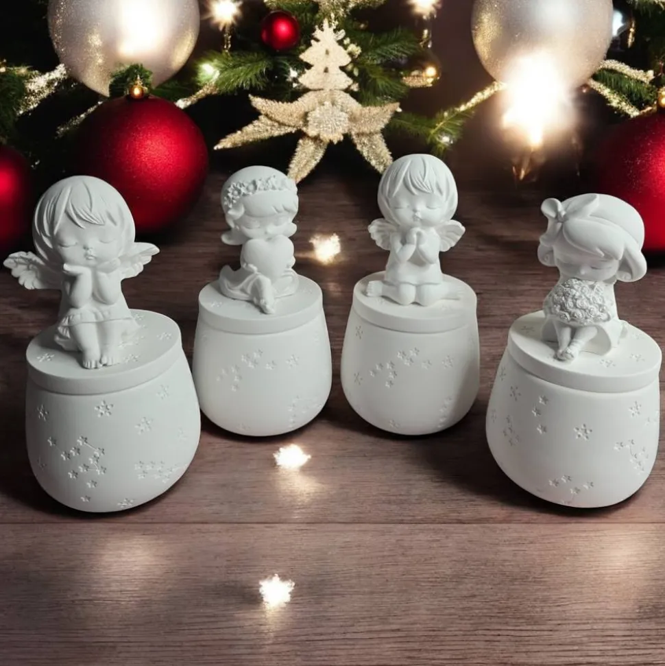 Der Deckel ist mit einer detailreichen Engel- oder Mädchenfigur gestaltet. Vier Motive stehen zur Auswahl: