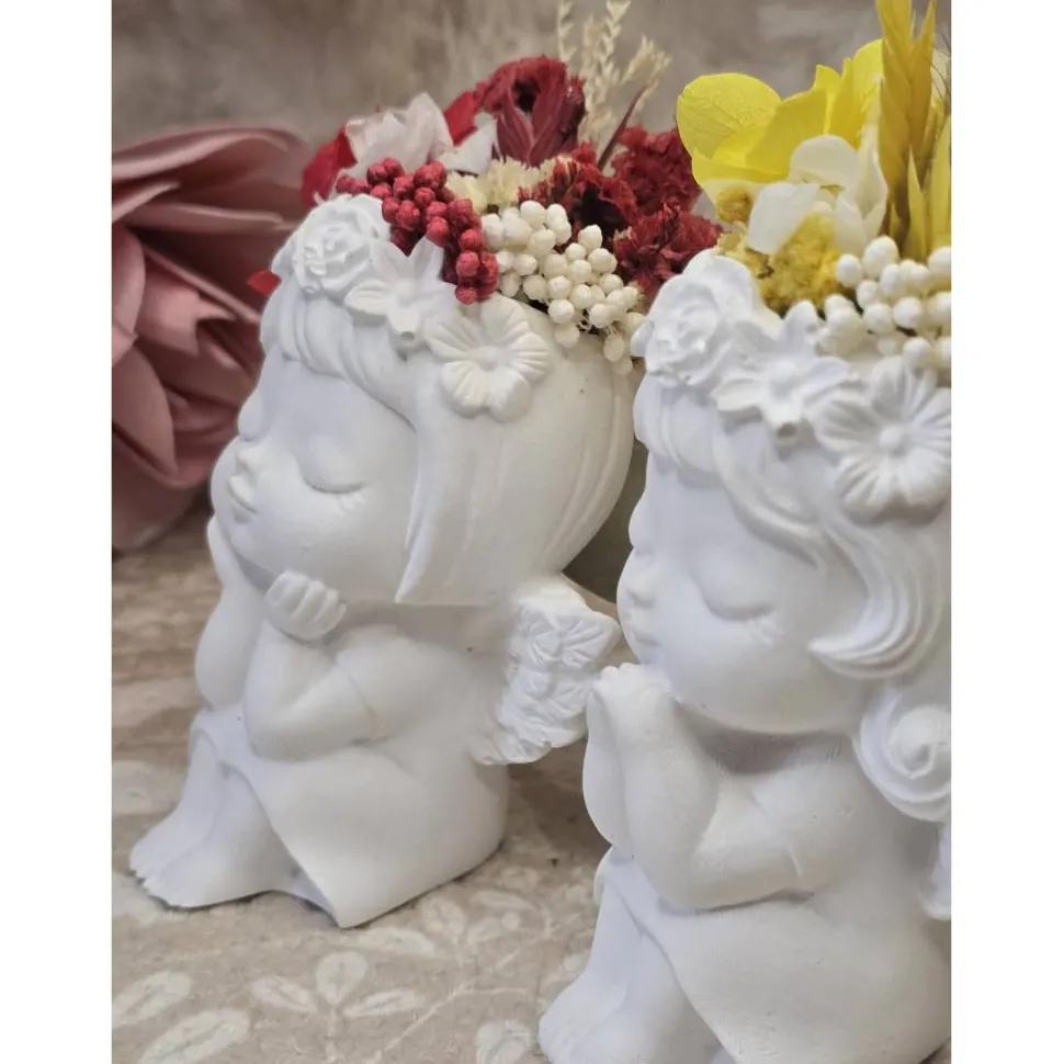 Die Figur „Amora“ begeistert mit warmen Rot- und Naturtönen und steht für Herz und Nähe. „Stella“ in Gelb- und Naturfarben erinnert an Licht und Zuversicht. Beide Engel sind im Kopfbereich kunstvoll mit echten Trockenblumen dekoriert – so erhält jedes Stück seinen eigenen Charakter.