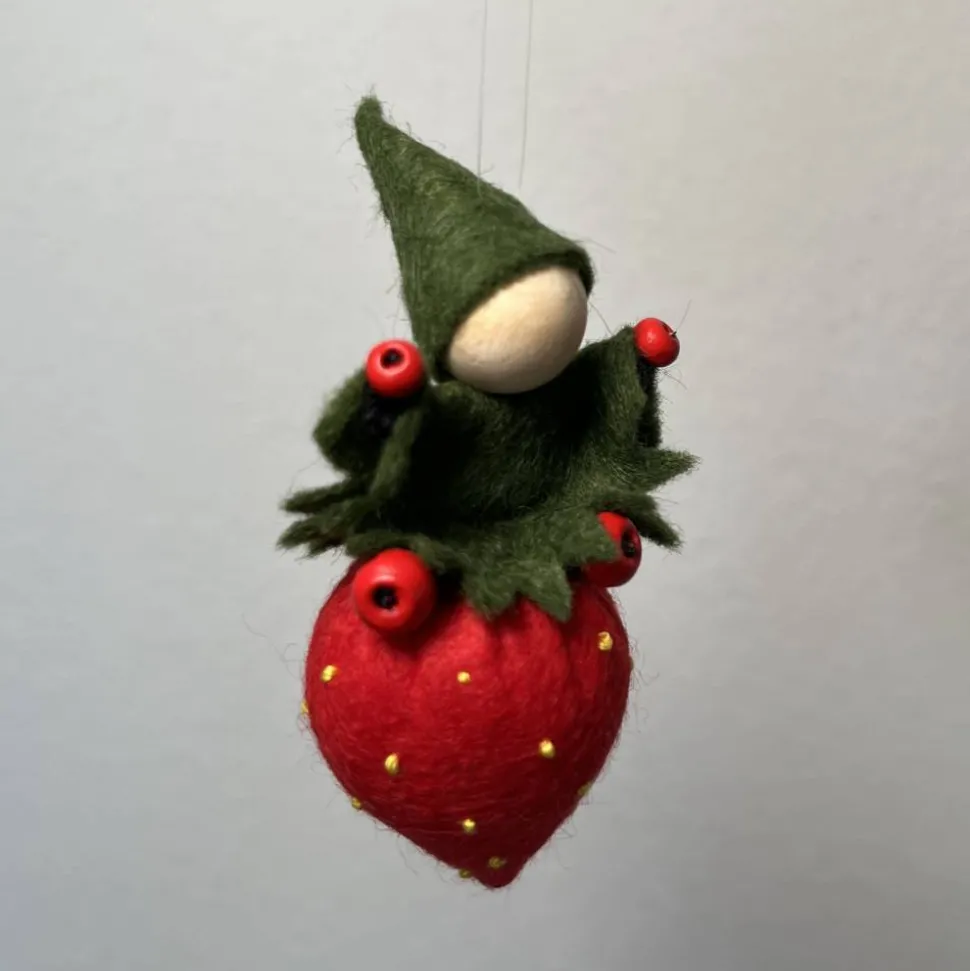 Die Erdbeeren sind mit reiner, süddeutscher Merinowolle ausgestopft. Die Wichtel sind aus roten Pfeifenputzer, Filz und Holzperlen genäht. Sie sitzen fröhlich auf einer Erdbeere. Die fröhlichen Erdbeerwichtel kann man schön ans Fenster oder über den Jahreszeitentisch hängen. Sie fühlen sich an vielen Orten wohl.
