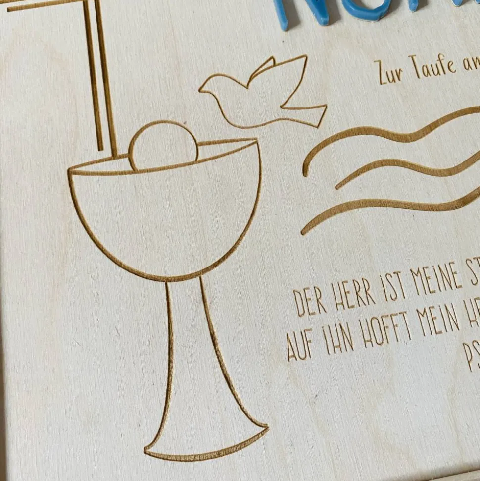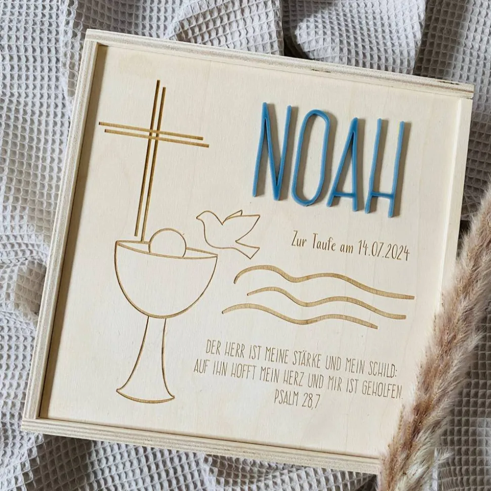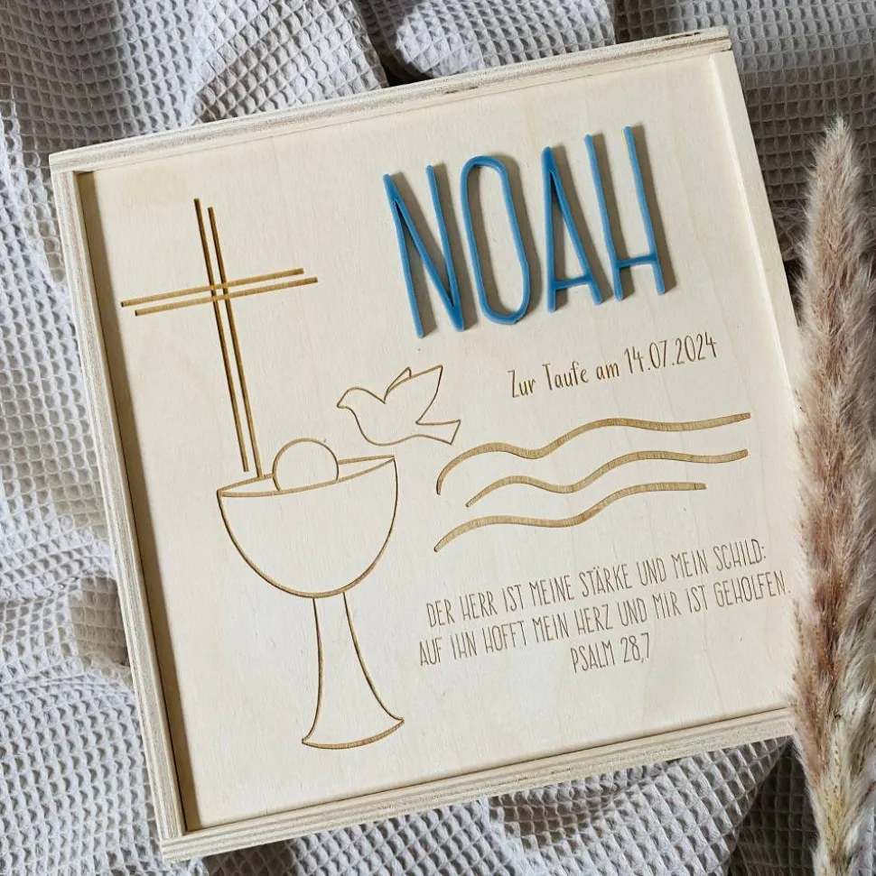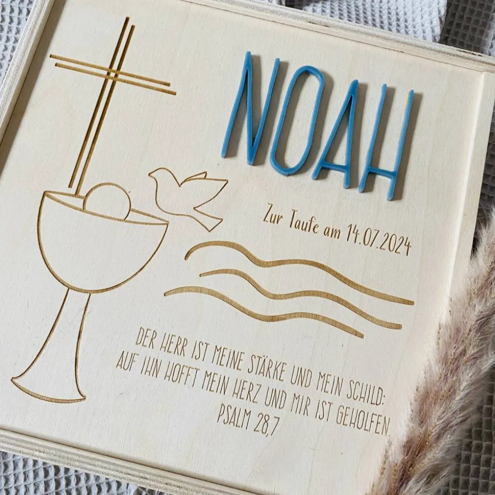 Diese liebevoll gestaltete Erinnerungsbox aus hochwertigem Naturholz ist ein ganz besonderes Geschenk zur Taufe und ein wunderschöner Ort für all die kleinen Schätze aus der Babyzeit. Mit einer Größe von 20×20 cm bietet sie ausreichend Platz für persönliche Erinnerungsstücke wie Fotos, Glückwunschkarten, das Armbändchen aus dem Krankenhaus, kleine Andenken oder besondere Momente aus den ersten Lebensjahren. Jede Box wird individuell mit dem Namen des Kindes, dem Taufdatum und einem passenden Motiv graviert – so entsteht ein einzigartiges Unikat, das ein Leben lang Freude bereitet.