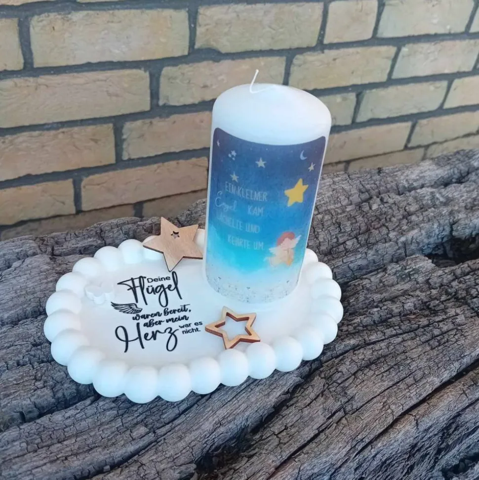 Ich habe für deine Gedenkecke in liebevoller Handarbeit aus Raysin dieses kleine ovale Tablett gegossen und mit dem Schriftzug „Deine Flügel waren bereit, aber mein Herz war es nicht“ verziert. Als kleines Accessoire bekommst du einen kleinen weißen Schmetterling aus Raysin sowie 2 kleine Sterne aus Holz dazu. Auf dem Untersetzer steht eine Kerze in zwei Varianten.