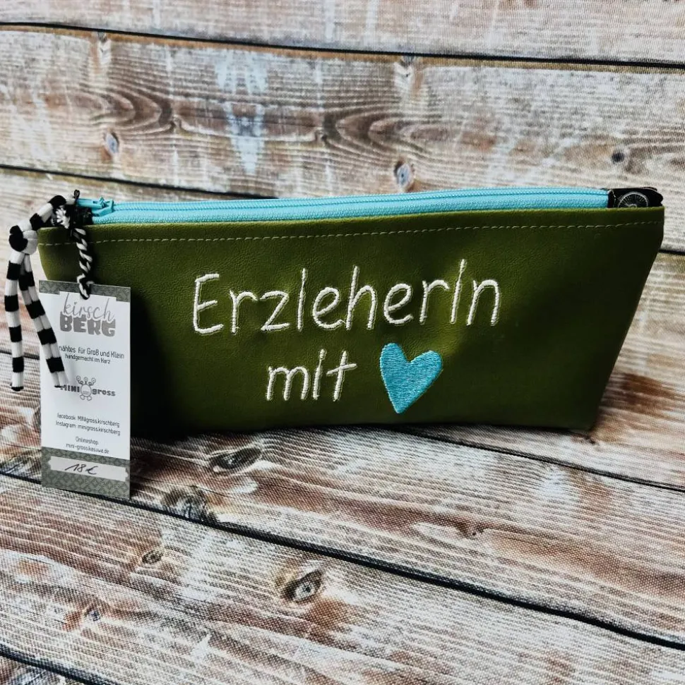 Das grüne Kunstleder wurde mit ‚Erzieherin mit ❤️‘ bestickt, so ist gleich klar, wem das Mäppchen gehört. Gefüttert wurde es mit einem Baumwollstoff mit lauter bunten Fahrrädern. Der Reißverschluss ist passend zum Futterstoff gewählt.