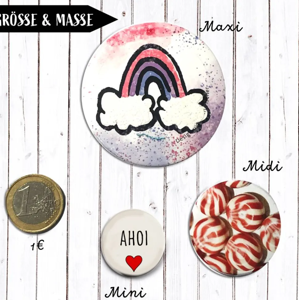 Die Motiv sind jetzt als trendiger Button für Jacke, Tasche oder Pulli. Der Magnet hält an jedem magnetischen Untergrund wie zum Beispiel an einem Kühlschrank oder der Memowand.