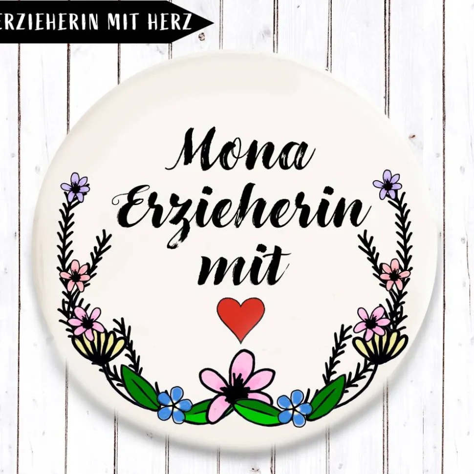 Ein Maxi oder Midi Button oder Magnet mit dem Motiv Erzieher mit Herz und Danke *Wunschname