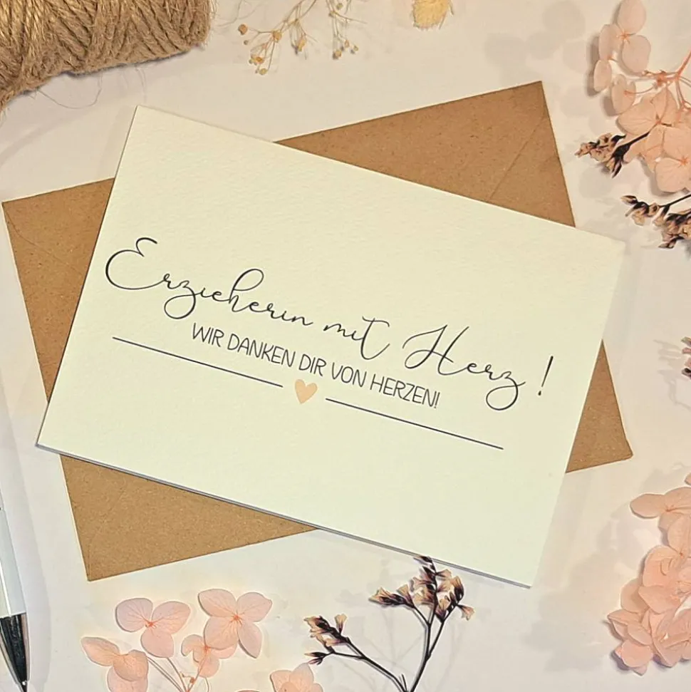 Auf der Dankeskarte steht kunstvoll geschrieben: „Erzieherin mit Herz! Wir danken Dir von Herzen!“ Du kannst zwischen der Ich- und Wir-Form wählen und auch eine Karte für deinen Lieblingserzieher aussuchen.