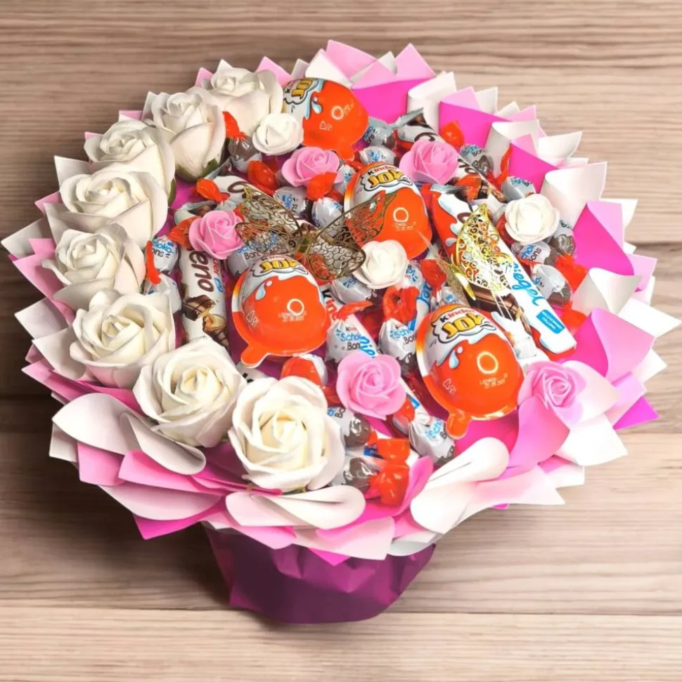 Dieser liebevoll gestaltete essbare Herz-Strauß mit Kinder Süßigkeiten ist ein echter Hingucker und eine süße Geschenkidee für jeden Anlass. In der Mitte befinden sich Kinder Joy Überraschungseier, ergänzt durch Kinder Bueno, Kinder Schokolade, Kinder Schoko-Bons sowie weitere originalverpackte Süßigkeiten.