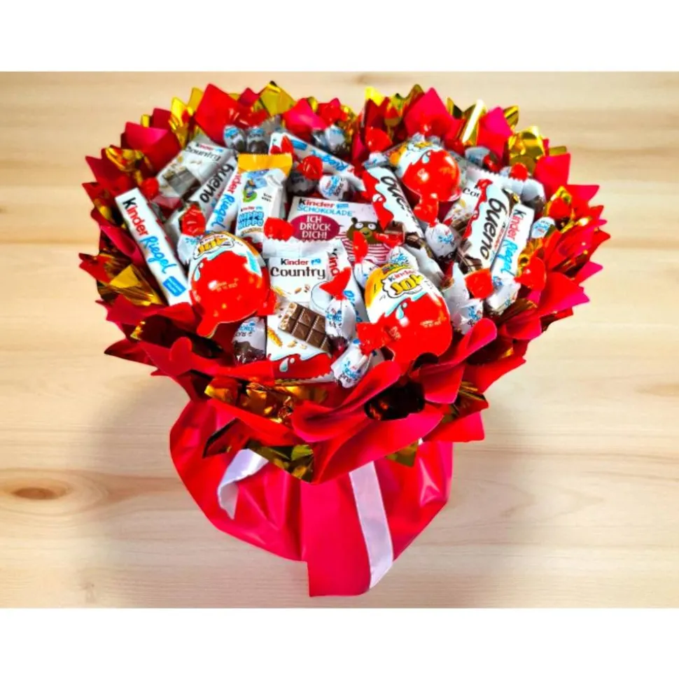 Der Strauß enthält eine sorgfältig ausgewählte Mischung aus Kinder Riegel, Kinder Bueno, Kinder Country, Kinder Joy, Kinder Überraschung sowie weiteren Kinder-Schokoladenartikeln. Die harmonische Kombination aus Rot, Weiß und Gold verleiht dem Arrangement eine festliche und hochwertige Optik. Abgerundet wird das Design durch glänzende Folien und eine dekorative Umrandung in Herzform.