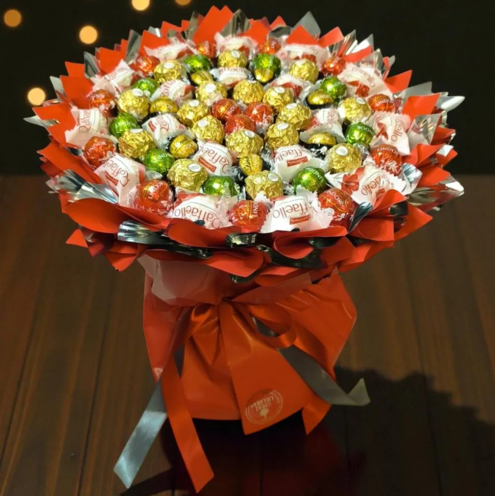 Im Strauß finden sich ausgewählte Pralinen wie Ferrero Rocher (goldene Kugeln), cremige Lindor-Pralinen (je nach Verfügbarkeit in verschiedenen Farben/Geschmacksrichtungen) sowie zarte Raffaello-Kokospralinen. Die Kombination aus Gold, Rot, Grün und Weiß wirkt besonders edel und passt zu vielen Anlässen.