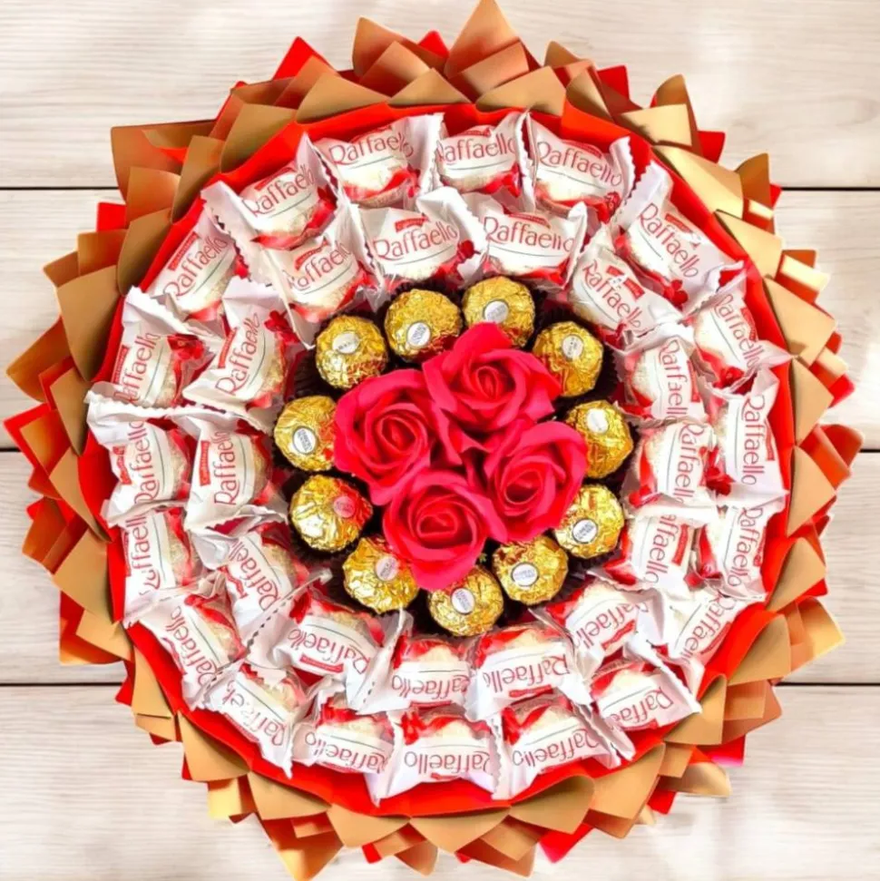 Dieser handgefertigte essbare Strauss wird in runder Form angefertigt und besteht aus originalverpackten Markenpralinen. Die äußere Schicht des Strausses ist gleichmäßig mit Raffaello Pralinen gestaltet. Im inneren Bereich befinden sich Ferrero Rocher, die zentral angeordnet sind.