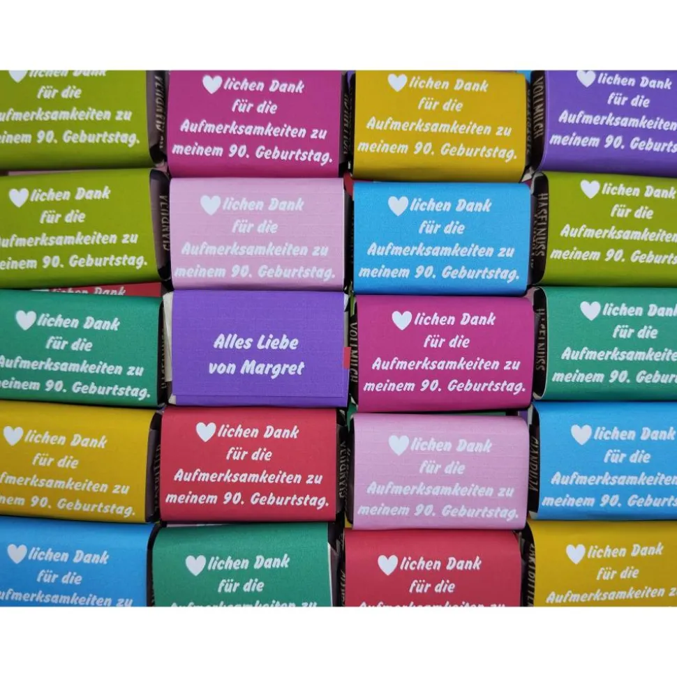 Schokoladentäfelchen mit einer Banderole umlegt, fertig bedruckt nach ihren Wünschen und Angaben –