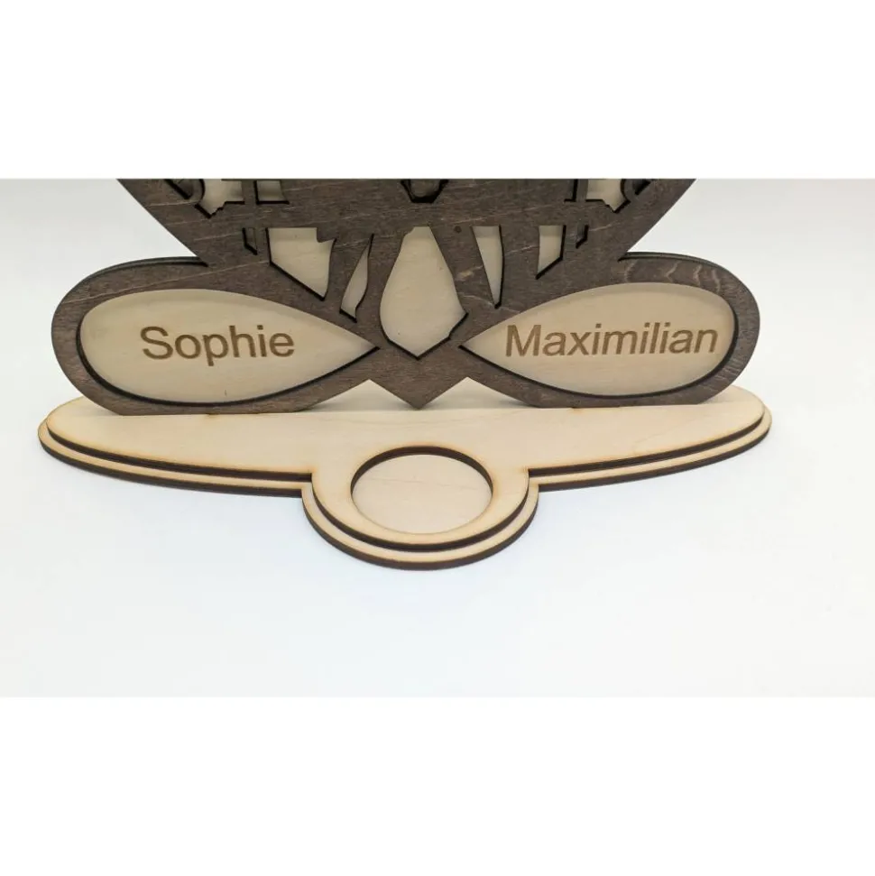 Edle Optik & individuelle Gravur: Die zweifarbige Gestaltung entsteht durch eine kontrastreiche Lasur der oberen Holzschicht, die sich farblich von der hellen Basis abhebt und so dem Motiv eine beeindruckende Tiefe verleiht. Lass die Namen Deiner Wahl gravieren und mache das Windlicht zu einem einzigartigen Geschenk – etwa für Paare wie Sophie & Maximilian.