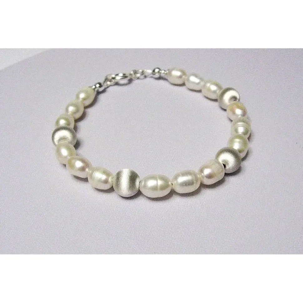 Dieses Perlenarmband besteht aus edlen Zuchtperlen-Oliven in Weiß, kombiniert mit 8 mm satinierten Kugeln sowie einem Verschluss aus Silber 925.