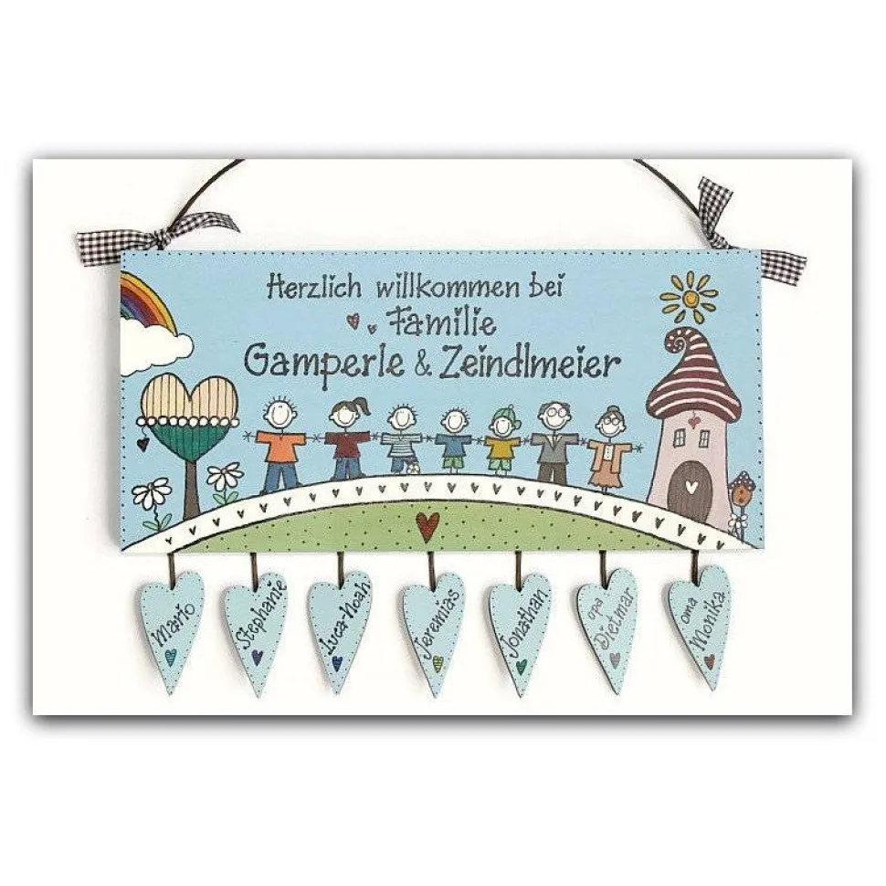 Das handgemachte Haustürschild überzeugt durch liebevolle Details und wird mit umweltfreundlichen, hochwertigen Farben bemalt. Jedes Schild ist ein Unikat und bietet Platz für bis zu sieben individuell handbemalte Figuren und Herzanhänger mit den Vornamen deiner Familienmitglieder.
