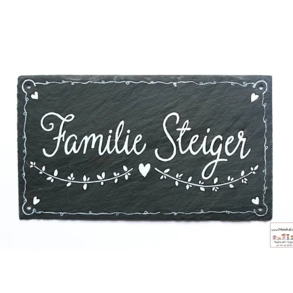Das Schild ist mit speziellem Schieferöl behandelt, poliert und farbecht bemalt – zur Reinigung genügt ein feuchtes Tuch. Passendes Montagematerial findest Du hier: