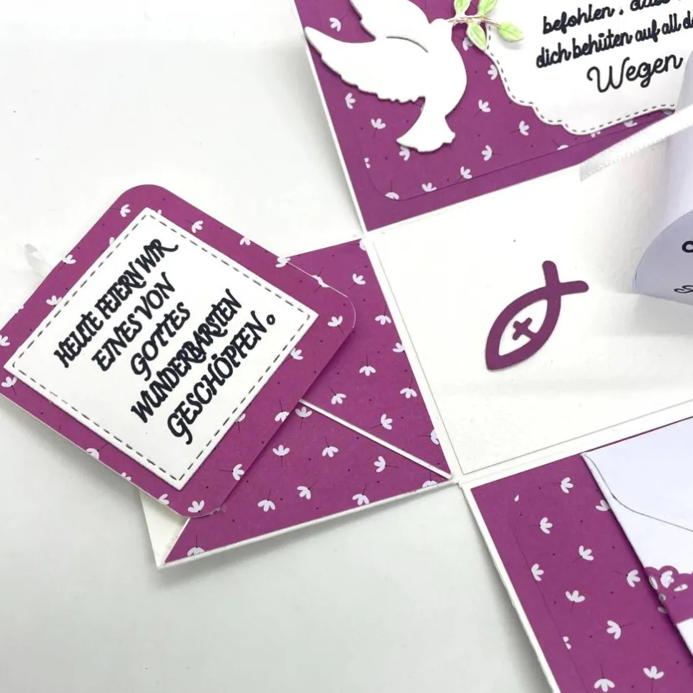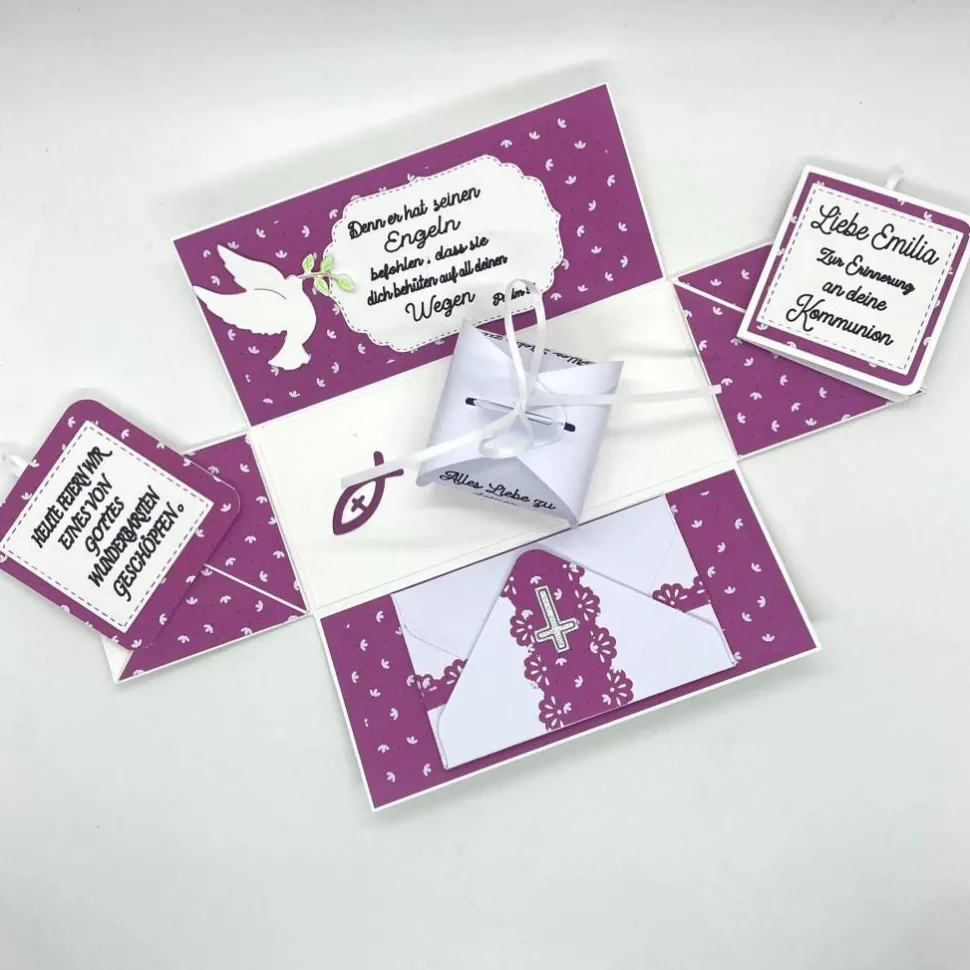 Die Explosionsbox ist ideal als Geldgeschenk zur Erstkommunion, Taufe oder als Patengeschenk. Ein integriertes Steckfach mit kleiner Karte bietet Platz für persönliche Glückwünsche, während ein Umschlag speziell für Geldscheine vorgesehen ist.