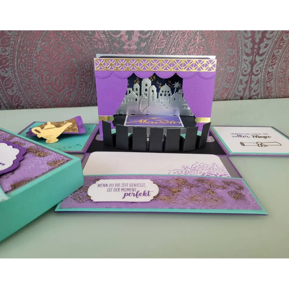 Auf der linken Seite ist der fliegende Teppich nach geahmt, sowie die Wunderlampe. Den Deckel habe ich so gestaltet, dass man nicht gleich erahnt, was sich dahinter verbirgt.