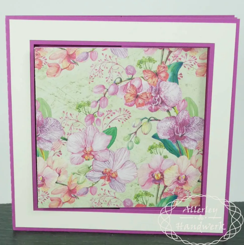 Nicht nur das quadratische Großformat mit knapp 15 cm Größe ist bei uns eher ungewöhnlich, „Mona“ ist zudem eine sogenannte Swing-Fold-Karte, bei der man auch geöffnet noch das Frontmotiv sehen kann. Davon abgesehen kann man sie sehr dekorativ aufstellen, wobei sie eine Breite von über 20 cm erreicht.