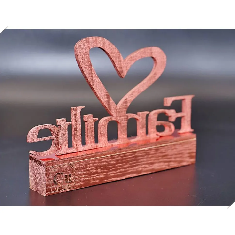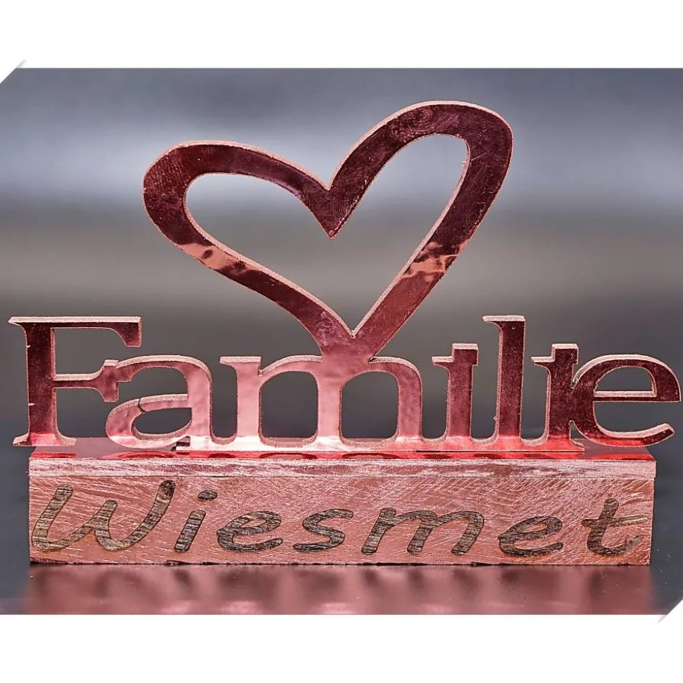 Exquisiten Familienaufsteller aus edlem Eichenholz, veredelt mit einer einzigartigen kupferfarbenen Beschichtung, durch die die natürliche Holzstruktur noch sanft hin durchscheint. Ein zeitloses Kunstwerk, das nicht nur dein Zuhause verschönert, sondern auch eine warme Botschaft der Verbundenheit trägt.