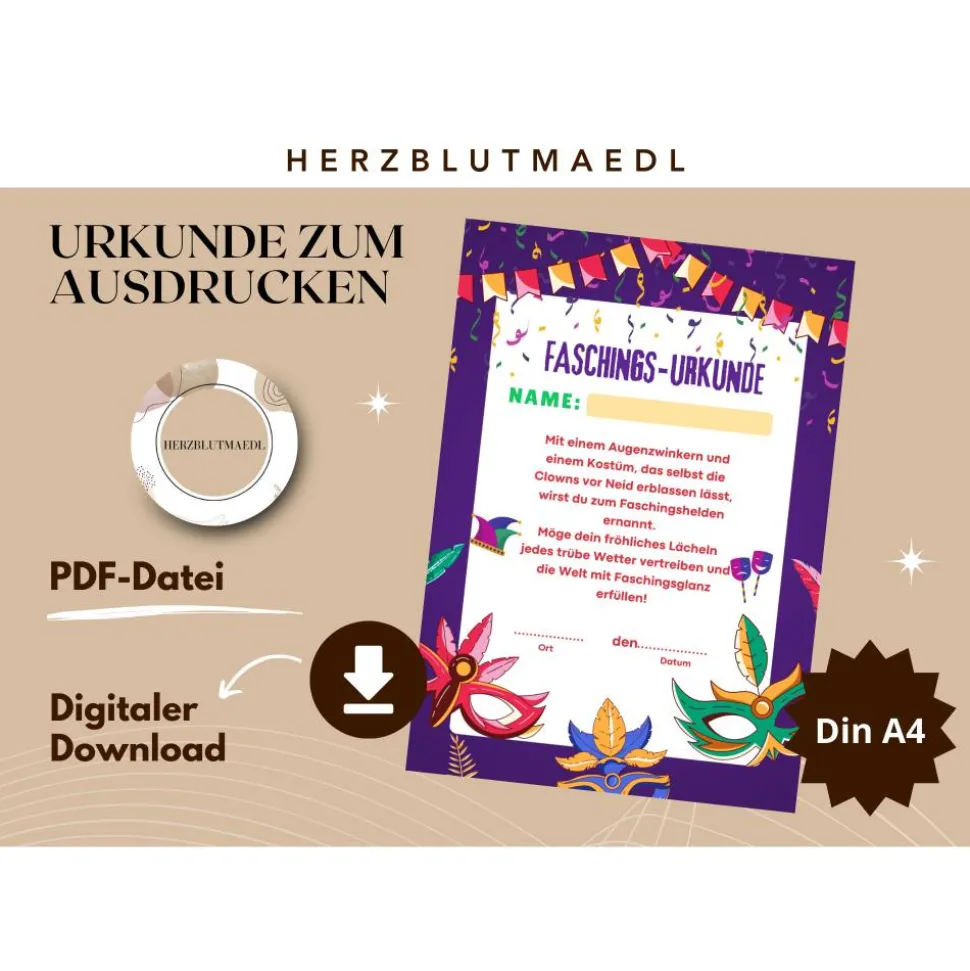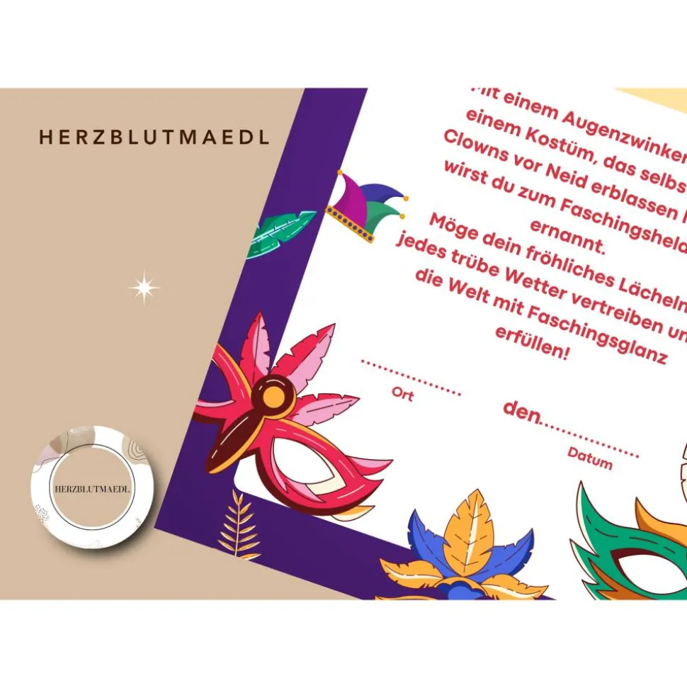 Mit diesen persönlichen Urkunden werden die Kids stolz ihre „Faschings“-Auszeichnung präsentieren. Hol sie dir jetzt und mach deine Faschingsparty zu einem unvergesslichen Abenteuer!