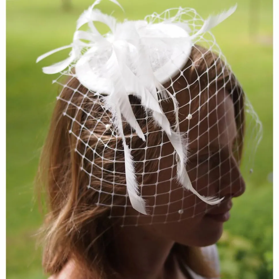 Er ist komplett von Hand gefertigt. Die Fascinator-Basis ist von Hand aus Sinamay und Ripsband geformt. Die Farben sind Weiß und sehr helles Creme.