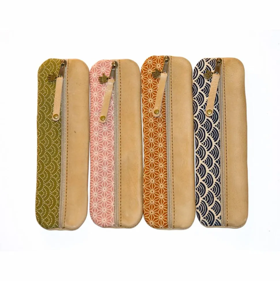 Handgefertigt aus hellbraunemNappaleder kombiniert mit traditionellem japanischen Stoff „Asanoha” in blau und beige.
