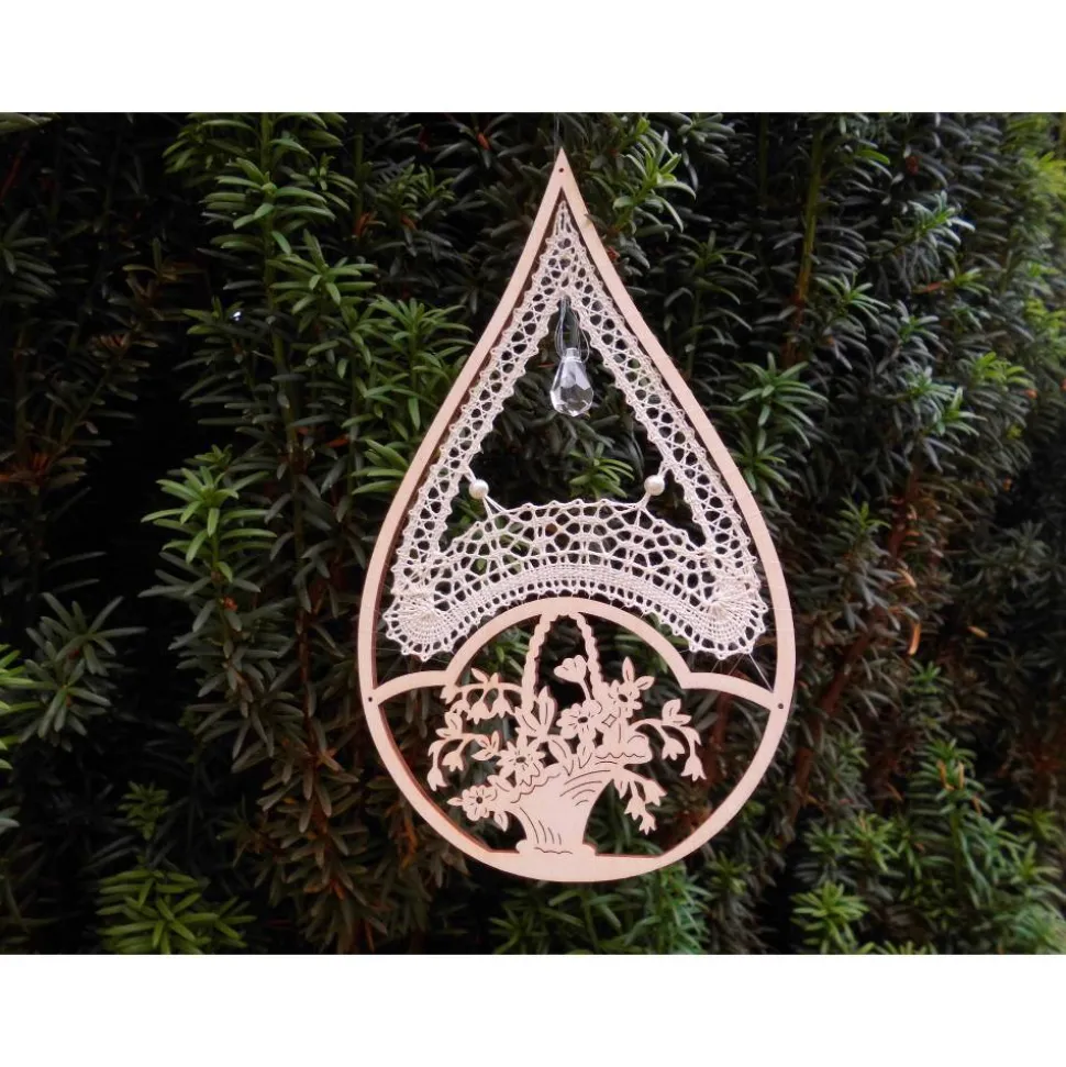 Zum Aufhängen des Klöppelbildes im Fenster ist oben am Tropfen ein dünner Faden angebracht.