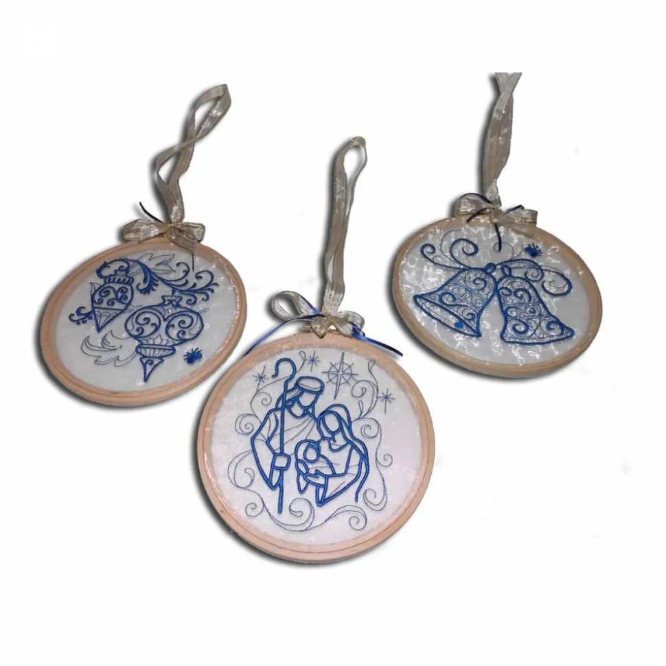 Ein Fensterbild der etwas anderen Art ist diese in einem Holz-Stickrahmen eingefasste Stickerei „Heilige Familie Krippe“ auf hauchzartem Organza. Das gestickte Motiv ist von beiden Seiten sichtbar. Der Innendurchmesser des Rahmens beträgt 19 cm. Ein farblich abgestimmtes Satinband mit einer Länge von 1 m ist beigefügt, so dass jeder seine gewünschte Länge bestimmen kann.